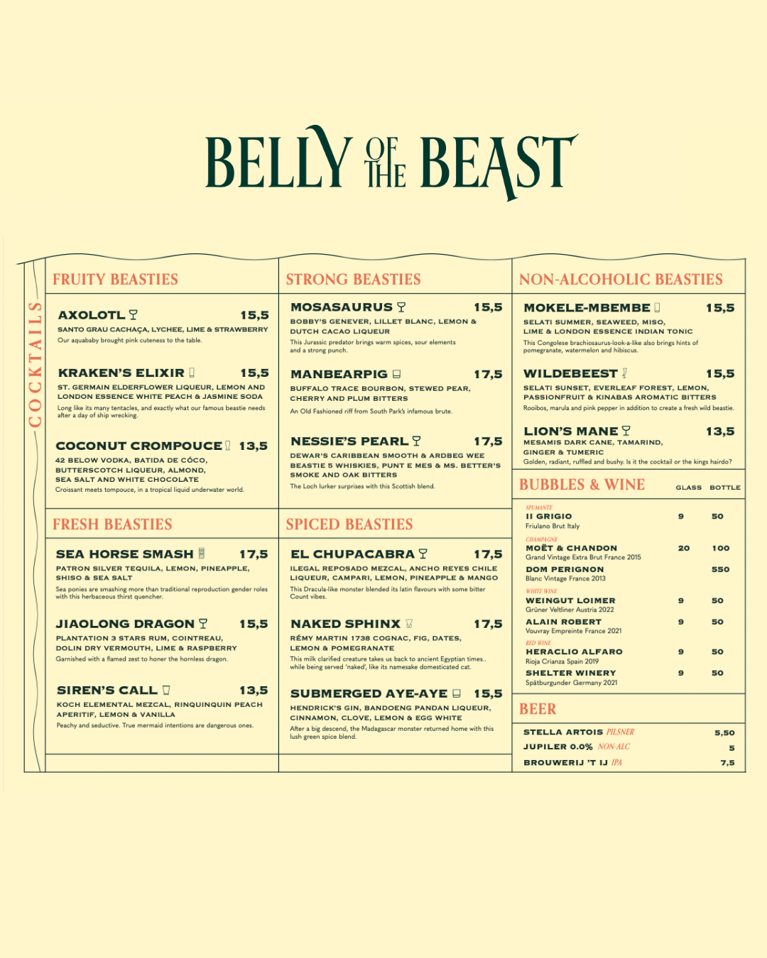 We’re here for anyone seeking an escape from the ordinary. Belly of the Beast offers an extensive range of cocktails and delicious bites. The interior unfolds a story; let yourself be carried away into the story of Belly of the Beast. The more you dive into the Belly of the Beast, the deeper and more mysterious it gets, until you find The Pearl.